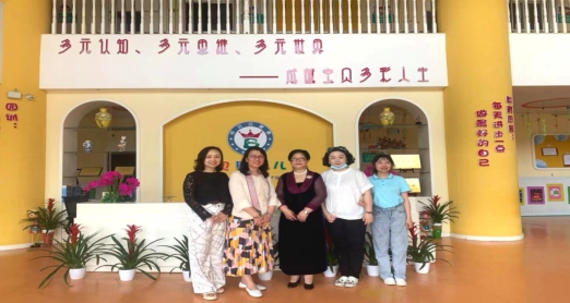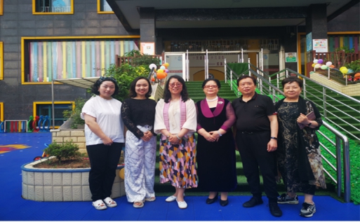 武汉市人民政府教育督导室督学、原武汉市教育局职业教育与成人教育处范振川处长(上图右二)、湖北省职业教育学前教育专业技能名师、武汉城市职业学院学前教育学院夏宇虹教授(上图左三)、学工办杨芳主任(上图左一)、学前第二党支部书记马豫副教授(上图左二)受邀参加了邦贝贝幼儿园举行的“童心向党,欢庆六一”文艺庆祝活动,和该园的全体师生及家长一起渡过了欢乐祥和的“六一”国际儿童节,并就该园儿童艺术教育与幼儿园课程的实施与建设给予了点评与指导。