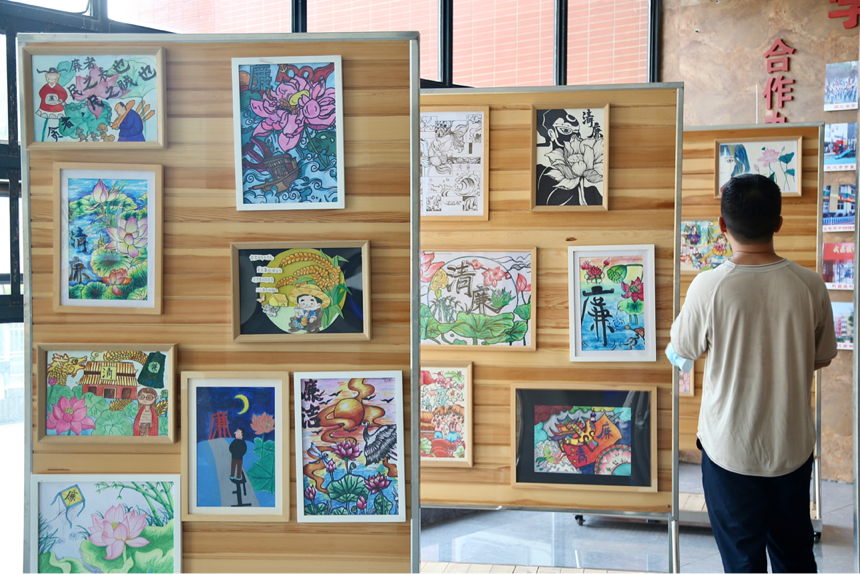 当天下午,经过老师和同学们的精心布置,优秀作品开始在艺术楼一楼大厅展示。优秀作品以润物无声的方式,将廉洁文化融入到校园文化建设,有助于培养学生廉洁高尚的道德情操,营造了崇廉尚廉校园文化氛围。