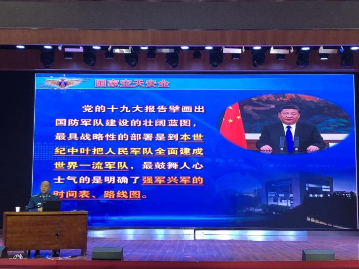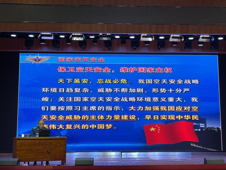 阮教授带领现场同学学习领悟习近平总书记关于国家空天安全讲话精神,并引导同学们学习临近空间的安全、航天轨道和航天器的安全、常规地面防空安全以及空天信息安全等国家空天安全的相关概念。