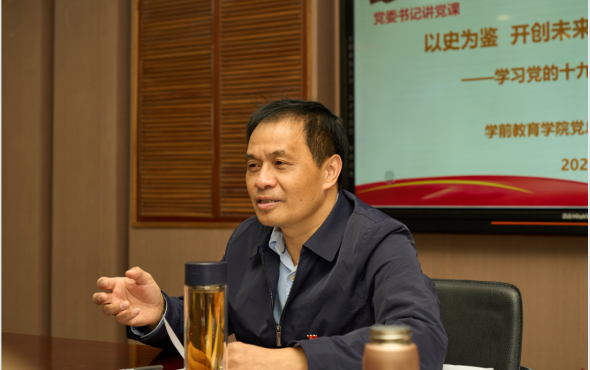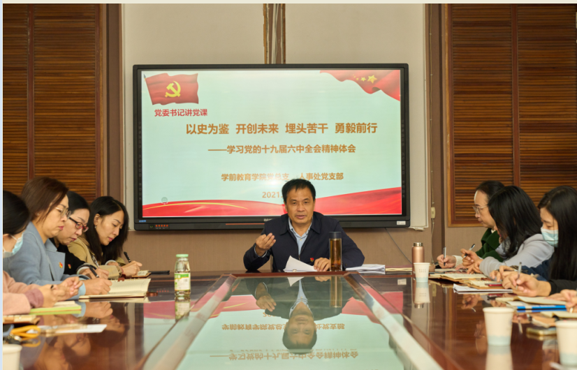 11月26日,党委书记邓院方在学前教育学院党建工作室为学前教育学院党总支和人事处党支部党员上了一堂“深入学习贯彻十九届六中全会精神”专题党课。