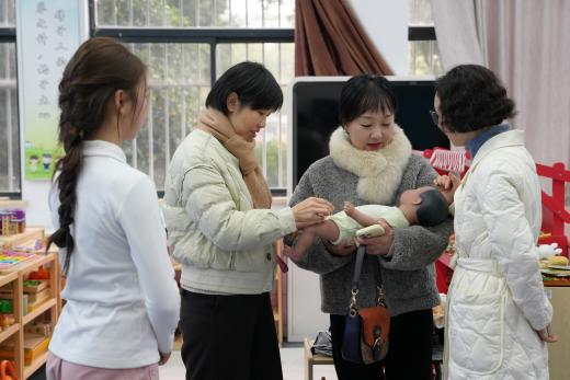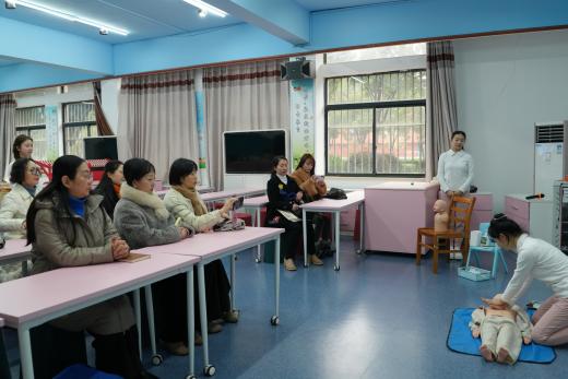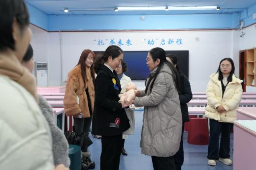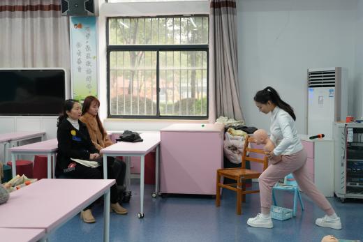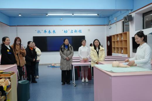活动伊始,大家来到了设施齐全、氛围温馨的亲子早教实训室。吴淋果老师系统介绍了实训室的设计理念、功能布局及课程设置。随后,我院学生团队现场演示了婴幼儿心肺复苏、气道异物急救、婴幼儿抚触手法及安抚哄睡等实操项目。同学们展现出扎实的技能与自然的关爱,赢得在场老师的阵阵掌声。