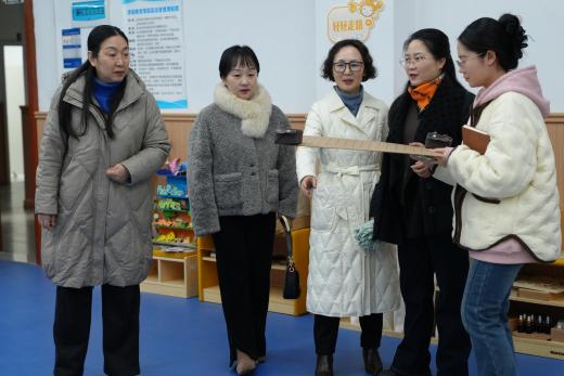 在游戏实训室,杨素苹院长向园长们介绍了该实训室在支持学生开展幼儿游戏设计、玩教具制作与运用、区域活动创设等方面的核心作用。学生们自制的各类玩教具与主题墙饰,展现了我院学生扎实的理论基础与出色的创新实践能力。