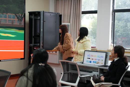 在虚拟仿真实训室,杨素苹院长分享了学院如何运用前沿技术赋能教学,学生们通过高仿真软件安全、反复地练习各类托育场景,提升学习的沉浸感与实效性。吴淋果老师现场演示了保育虚拟实训系统的具体功能,并邀请企业老师亲身体验了虚拟现实环境下的婴幼儿心肺复苏实操项目。